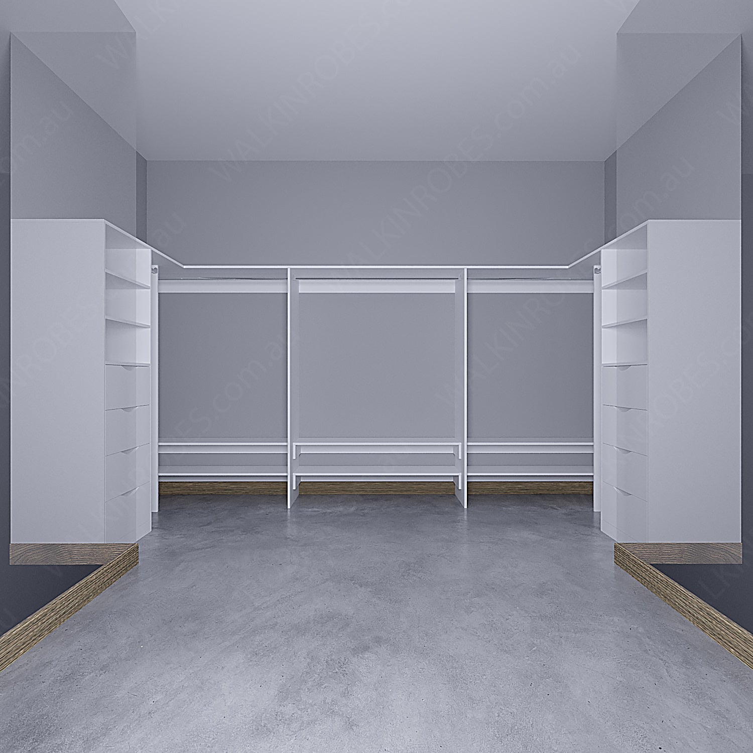 This U-Shape model from walkinrobes.com.au is perfect for organizing walk-in-robes, pantries, and master bedrooms. It is customized with drawer units, shelving, and various hanging options, including shoe shelves, for maximum storage possibilities. Take advantage of its flexibility and optimize your storage space.