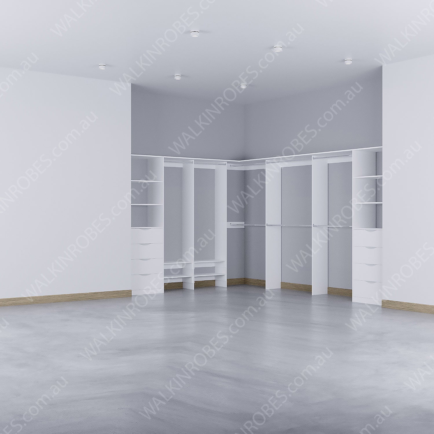 This L-shaped corner wardrobe model offers a variety of setup options to suit your needs, including drawer units, adjustable or fixed shelves, and shoe shelves. It also allows for all types of hanging garments, making it a perfect solution for your wardrobe storage needs.