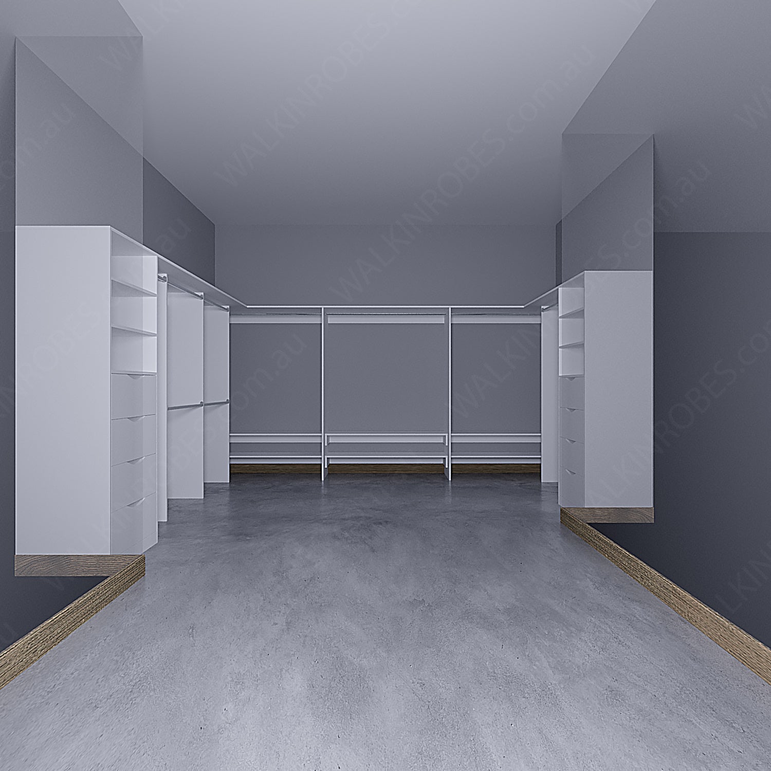 This U-Shape model from walkinrobes.com.au is perfect for organizing walk-in-robes, pantries, and master bedrooms. It is customized with drawer units, shelving, and various hanging options, including shoe shelves, for maximum storage possibilities. Take advantage of its flexibility and optimize your storage space.