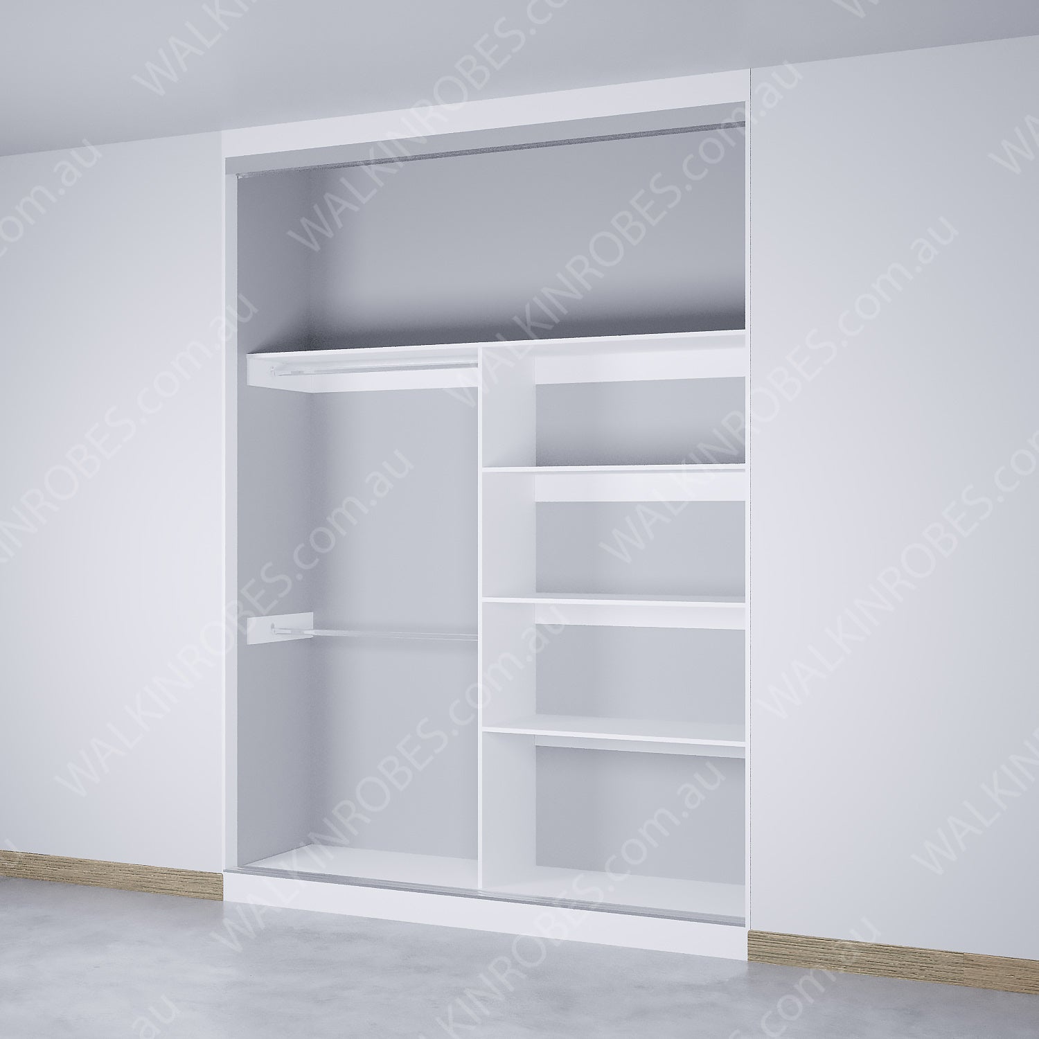This wardrobe model is designed to be built-in into the wall to wall space for a seamless floor-to-ceiling installation with an integrated bulkhead and raised flooring. It is suitable for any room with enough space, and its multiple setup options including drawer units, hanging variations, and fixed shelving make it a versatile and space-saving choice. Sliding doors are available separately.
