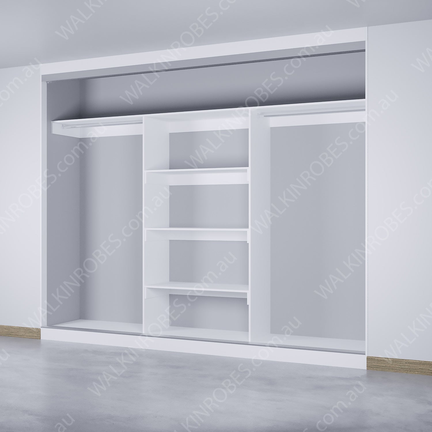 This wardrobe model is designed to be built-in into the wall to wall space for a seamless floor-to-ceiling installation with an integrated bulkhead and raised flooring. It is suitable for any room with enough space, and its multiple setup options including drawer units, hanging variations, and fixed shelving make it a versatile and space-saving choice. Sliding doors are available separately.