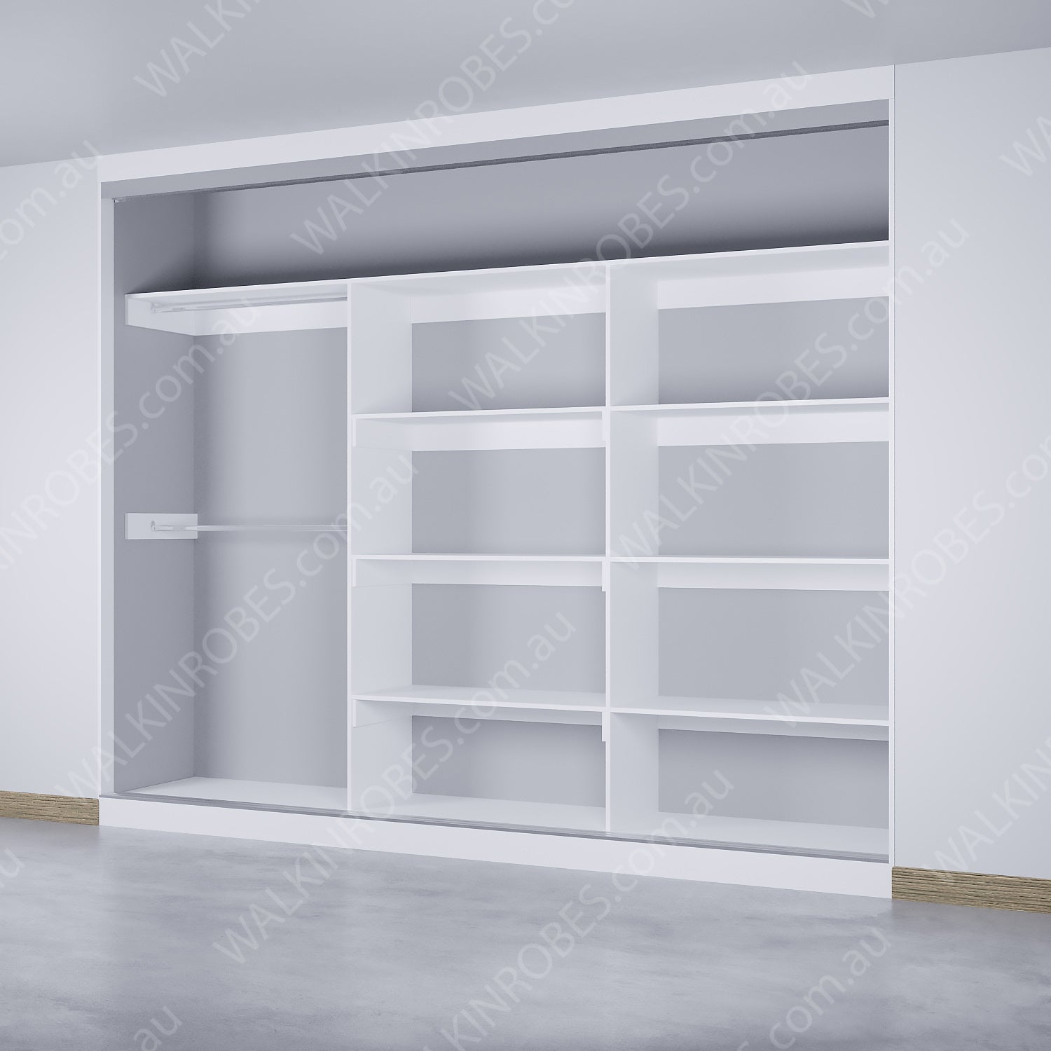 This wardrobe model is designed to be built-in into the wall to wall space for a seamless floor-to-ceiling installation with an integrated bulkhead and raised flooring. It is suitable for any room with enough space, and its multiple setup options including drawer units, hanging variations, and fixed shelving make it a versatile and space-saving choice. Sliding doors are available separately.