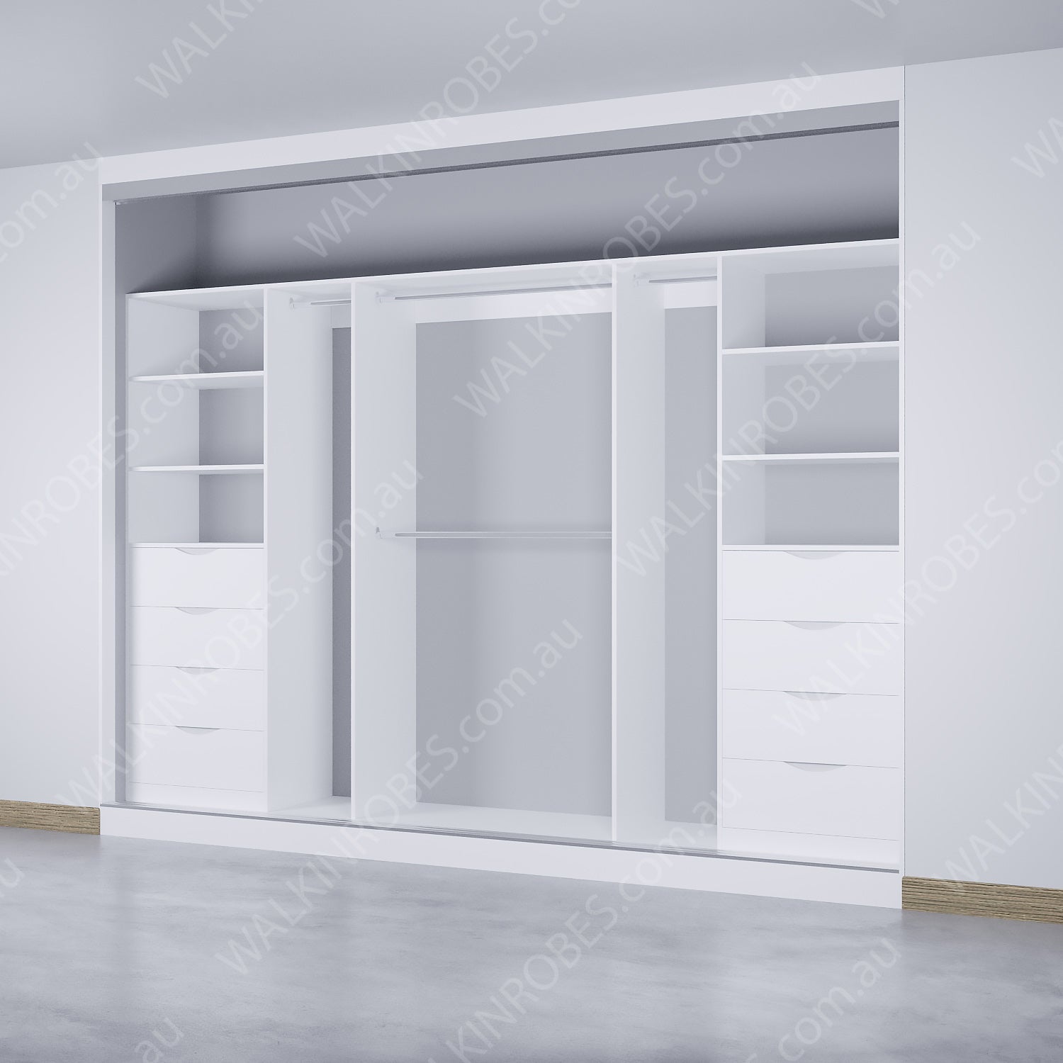 This wardrobe model is designed to be built-in into the wall to wall space for a seamless floor-to-ceiling installation with an integrated bulkhead and raised flooring. It is suitable for any room with enough space, and its multiple setup options including drawer units, hanging variations, and fixed shelving make it a versatile and space-saving choice. Sliding doors are available separately.