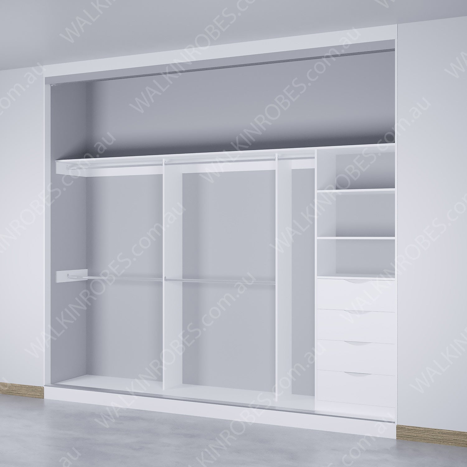 This wardrobe model is designed to be built-in into the wall to wall space for a seamless floor-to-ceiling installation with an integrated bulkhead and raised flooring. It is suitable for any room with enough space, and its multiple setup options including drawer units, hanging variations, and fixed shelving make it a versatile and space-saving choice. Sliding doors are available separately.