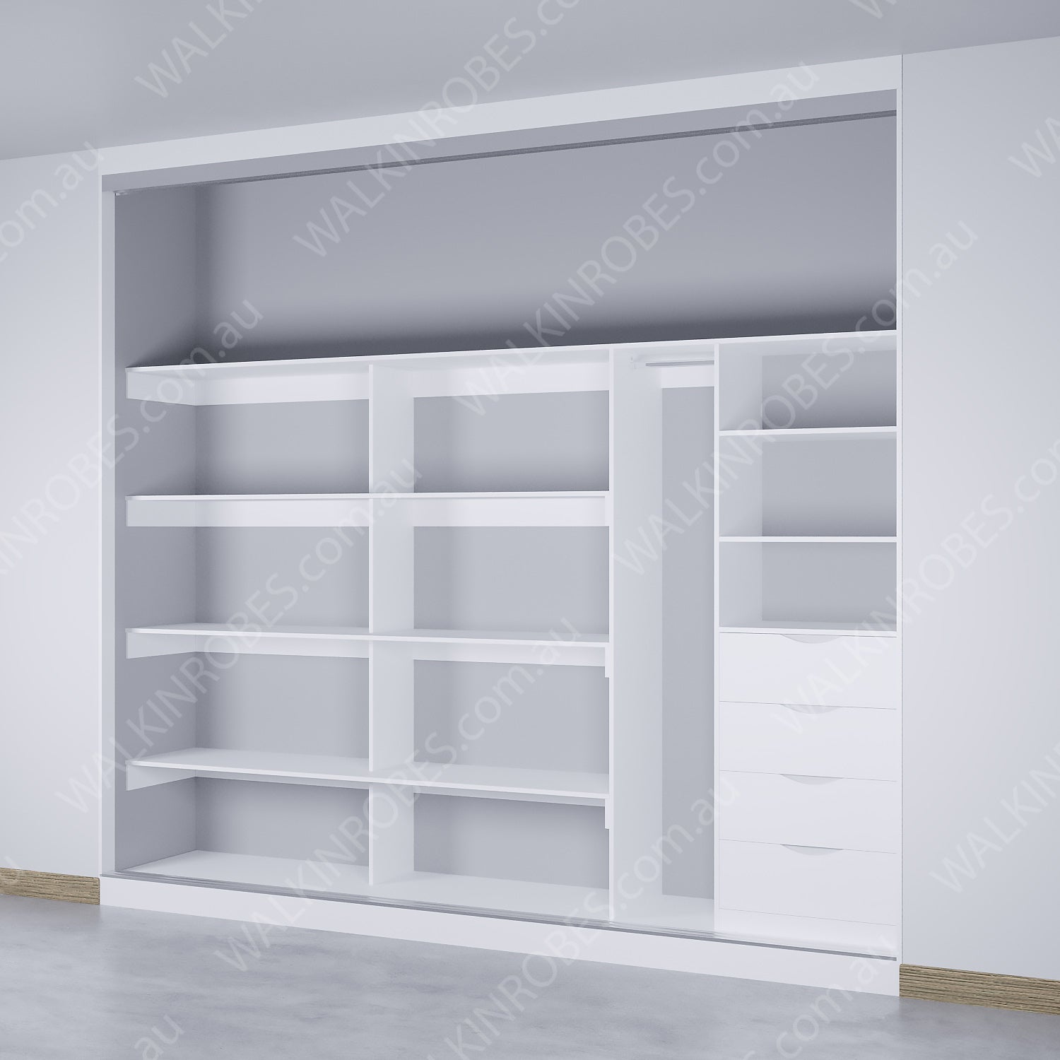 This wardrobe model is designed to be built-in into the wall to wall space for a seamless floor-to-ceiling installation with an integrated bulkhead and raised flooring. It is suitable for any room with enough space, and its multiple setup options including drawer units, hanging variations, and fixed shelving make it a versatile and space-saving choice. Sliding doors are available separately.