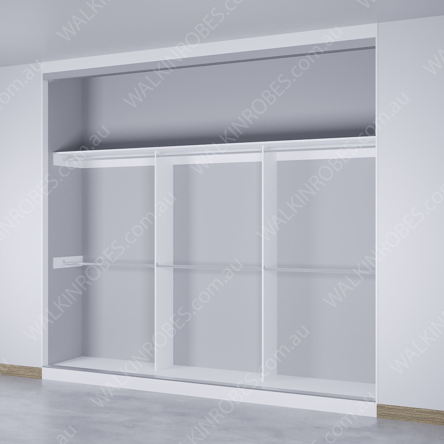 This wardrobe model is designed to be built-in into the wall to wall space for a seamless floor-to-ceiling installation with an integrated bulkhead and raised flooring. It is suitable for any room with enough space, and its multiple setup options including drawer units, hanging variations, and fixed shelving make it a versatile and space-saving choice. Sliding doors are available separately.
