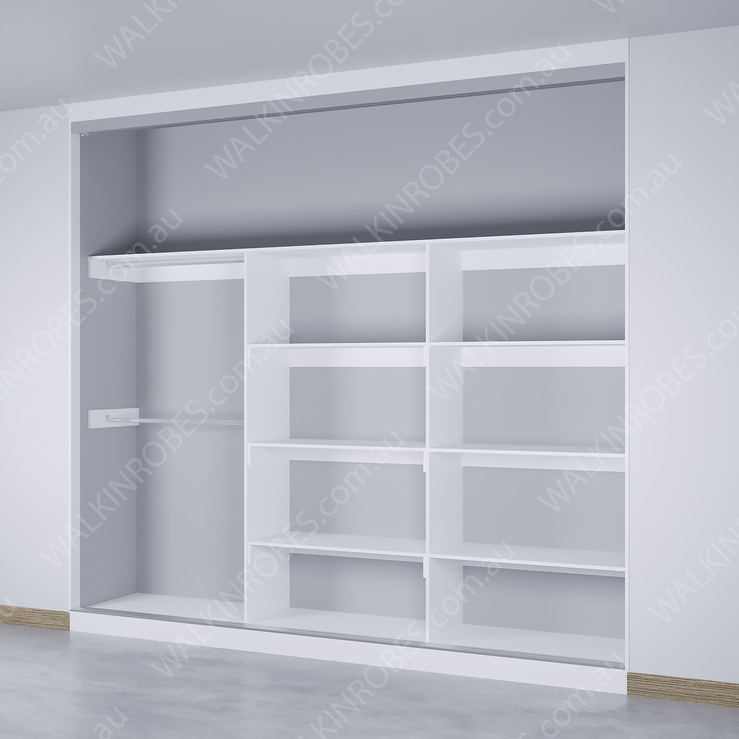 This wardrobe model is designed to be built-in into the wall to wall space for a seamless floor-to-ceiling installation with an integrated bulkhead and raised flooring. It is suitable for any room with enough space, and its multiple setup options including drawer units, hanging variations, and fixed shelving make it a versatile and space-saving choice. Sliding doors are available separately.