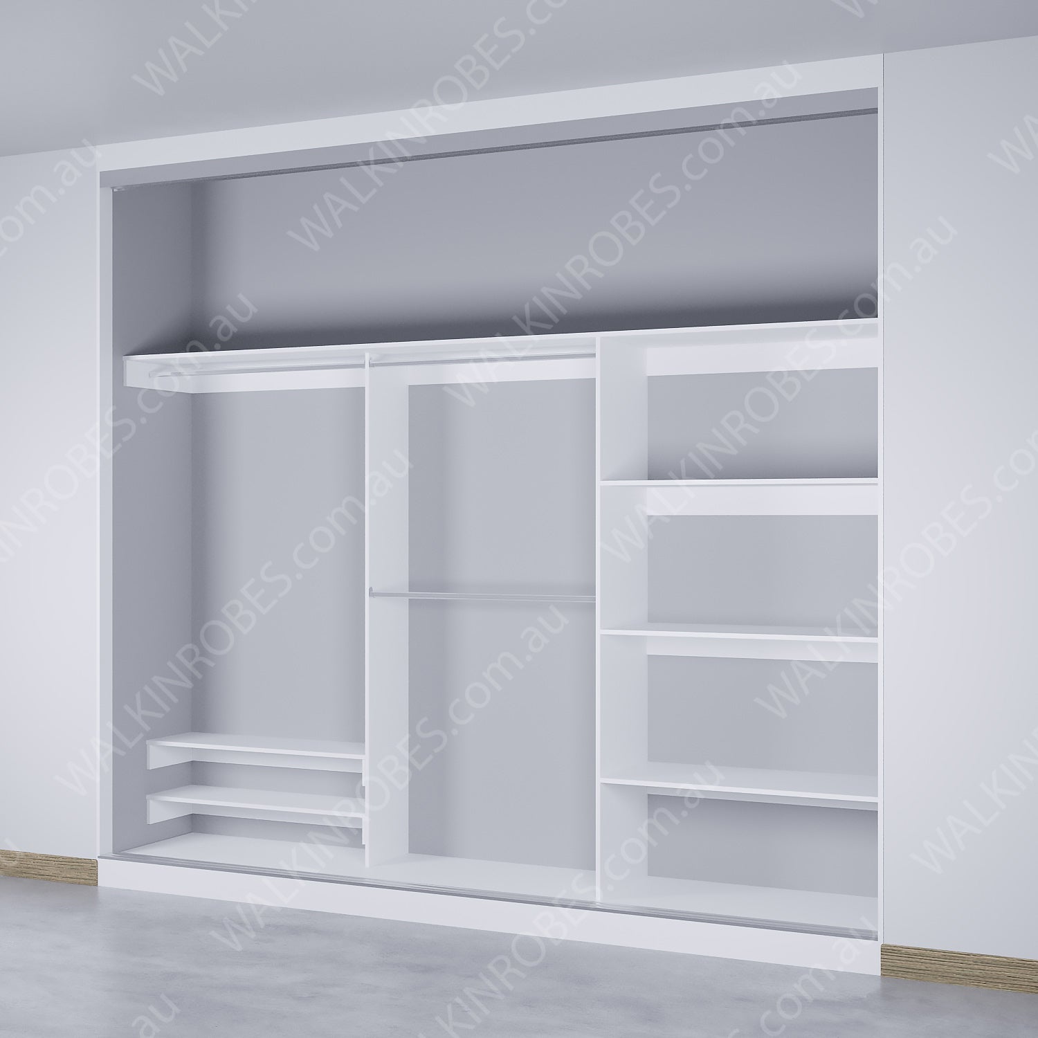 This wardrobe model is designed to be built-in into the wall to wall space for a seamless floor-to-ceiling installation with an integrated bulkhead and raised flooring. It is suitable for any room with enough space, and its multiple setup options including drawer units, hanging variations, and fixed shelving make it a versatile and space-saving choice. Sliding doors are available separately.
