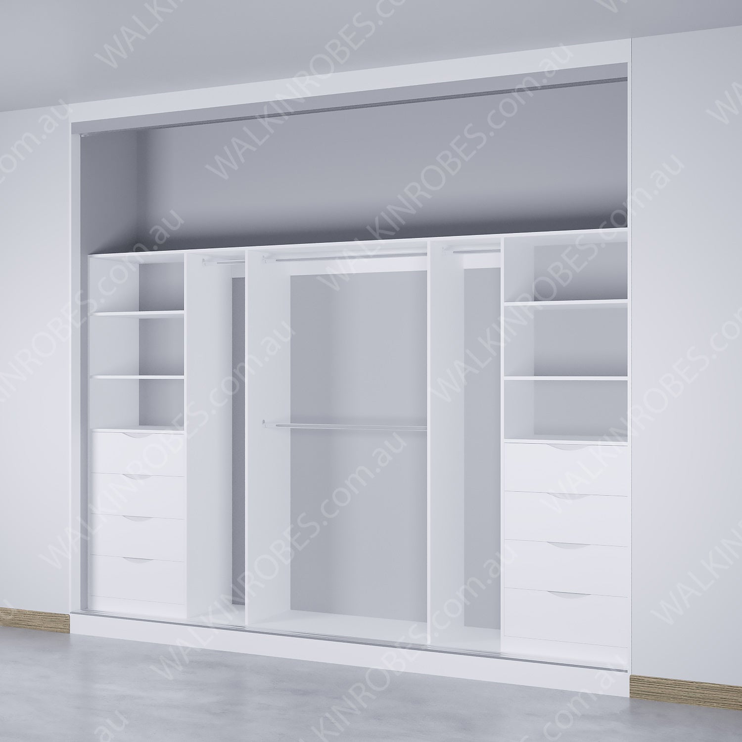 This wardrobe model is designed to be built-in into the wall to wall space for a seamless floor-to-ceiling installation with an integrated bulkhead and raised flooring. It is suitable for any room with enough space, and its multiple setup options including drawer units, hanging variations, and fixed shelving make it a versatile and space-saving choice. Sliding doors are available separately.
