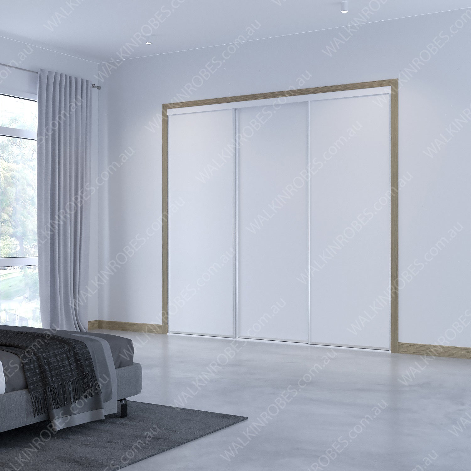 This set of three framed Vinyl doors with silver finish offers simple, beautiful storage solutions. The sliding wardrobe doors function smoothly, taking up minimal space. Perfect for adding a touch of sophistication to any décor.